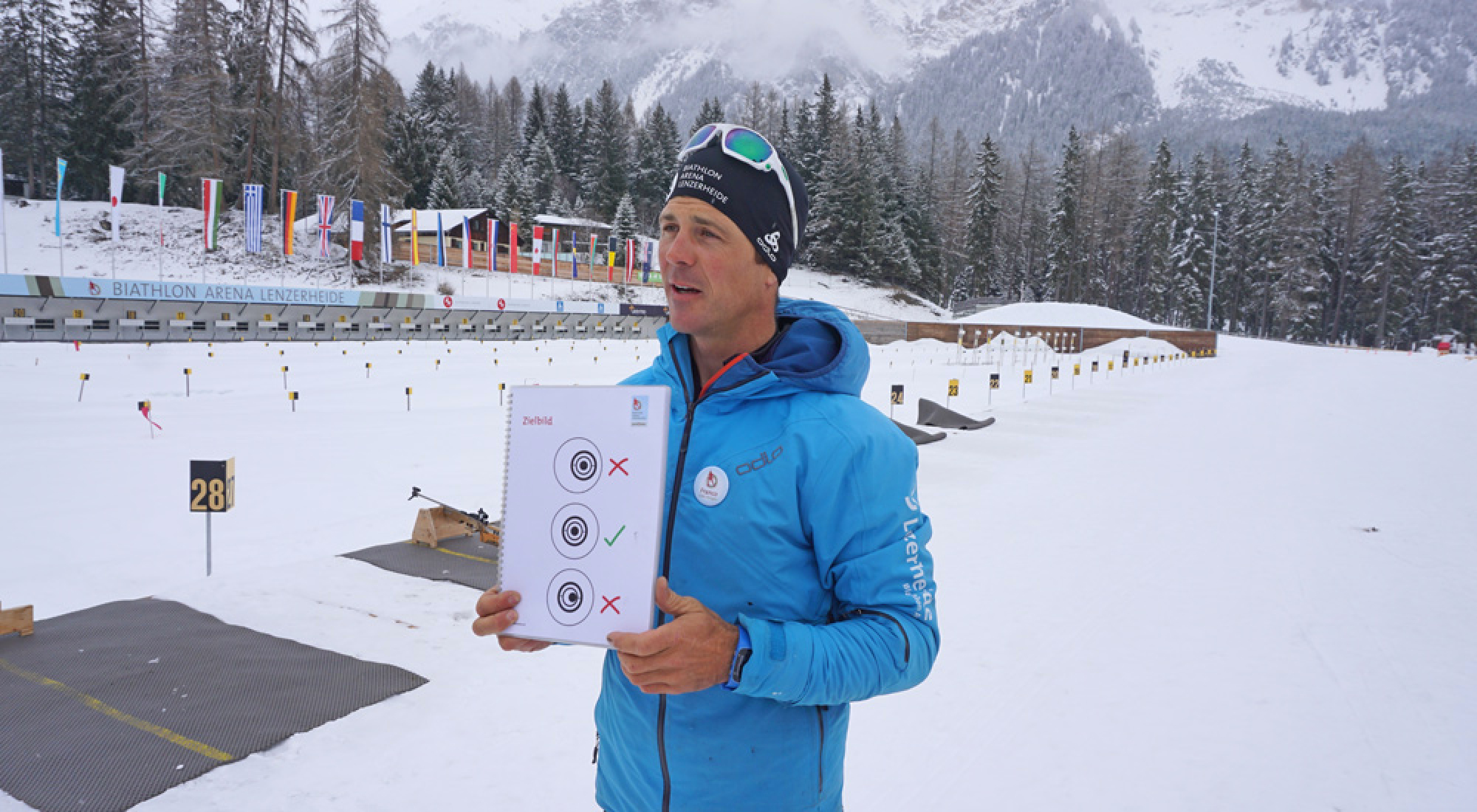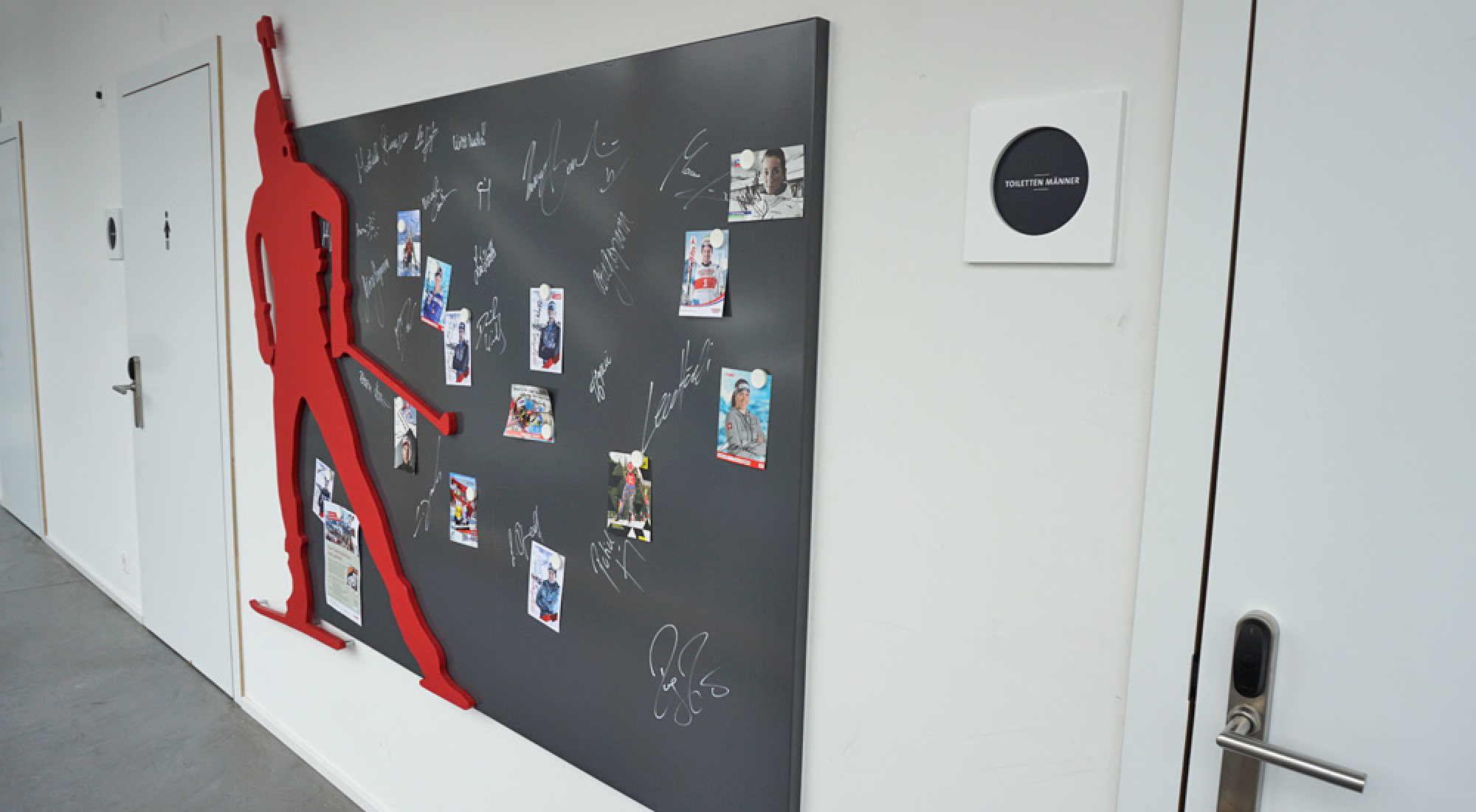 Möglich ist dies in der Biathlon Arena Lenzerheide, die nur wenige Kilometer außerhalb des Orts Lenzerheide in Graubünden liegt. Bevor es losgehen kann, brauchen wir erst einmal das nötige Equipment. Das gibt es im Activ Sport Shop, wo wir mit passenden Schuhen, Ski und Stöcken ausgestattet werden. Im Flur vor dem Sport Shop wartet übrigens direkt ein Motivationsschub auf uns: Auf einer großen Tafel haben die Biathlonstars unterschrieben, die hier regelmäßig zum Training zu Gast sind: Neben der Lokalmatadorin Selina Gasparin können wir auch die Autogramme von Dorothea Wierer und Lukas Hofer entziffern.