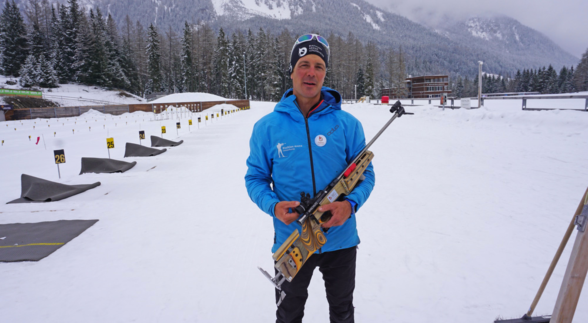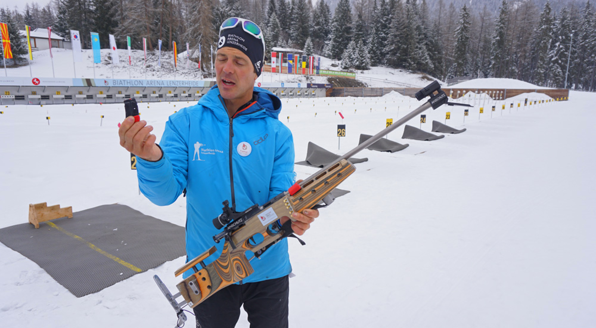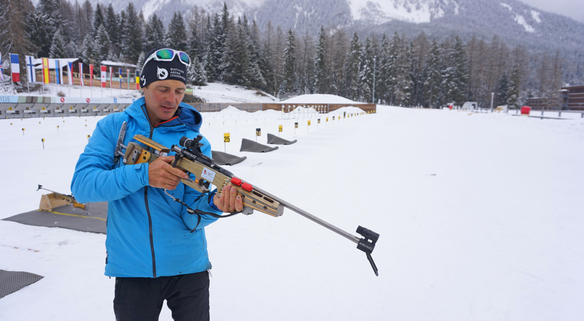 Zuallererst erklärt uns Franco erstmal die Basics über das Gewehr: Wir schießen heute mit einer Standardwaffe der Firma Anschütz - übrigens nutzen geschätzt 95% der Athleten im Weltcup Gewehre dieser deutschen Firma! Während bei den Profis der Holzschaft der Waffe genau auf die jeweilige Körpergröße abgestimmt ist, müssen wir uns mit der vorhandenen Länge arrangieren - eine gute Ausrede, falls es mit dem Treffen nicht so klappt! Das Gewehr ist 3,8 kg schwer und muss nach jedem Schuss mechanisch geladen werden. Da es in einem Biathlon-Wettkampf maximal vier Schießeinlagen gibt, hat die Waffe vier Löcher, in denen jeweils ein Magazin mit fünf Schuss eingesetzt werden kann. Außerdem hat man am Gewehr noch Platz für einzelne Patronen zum Nachladen.
