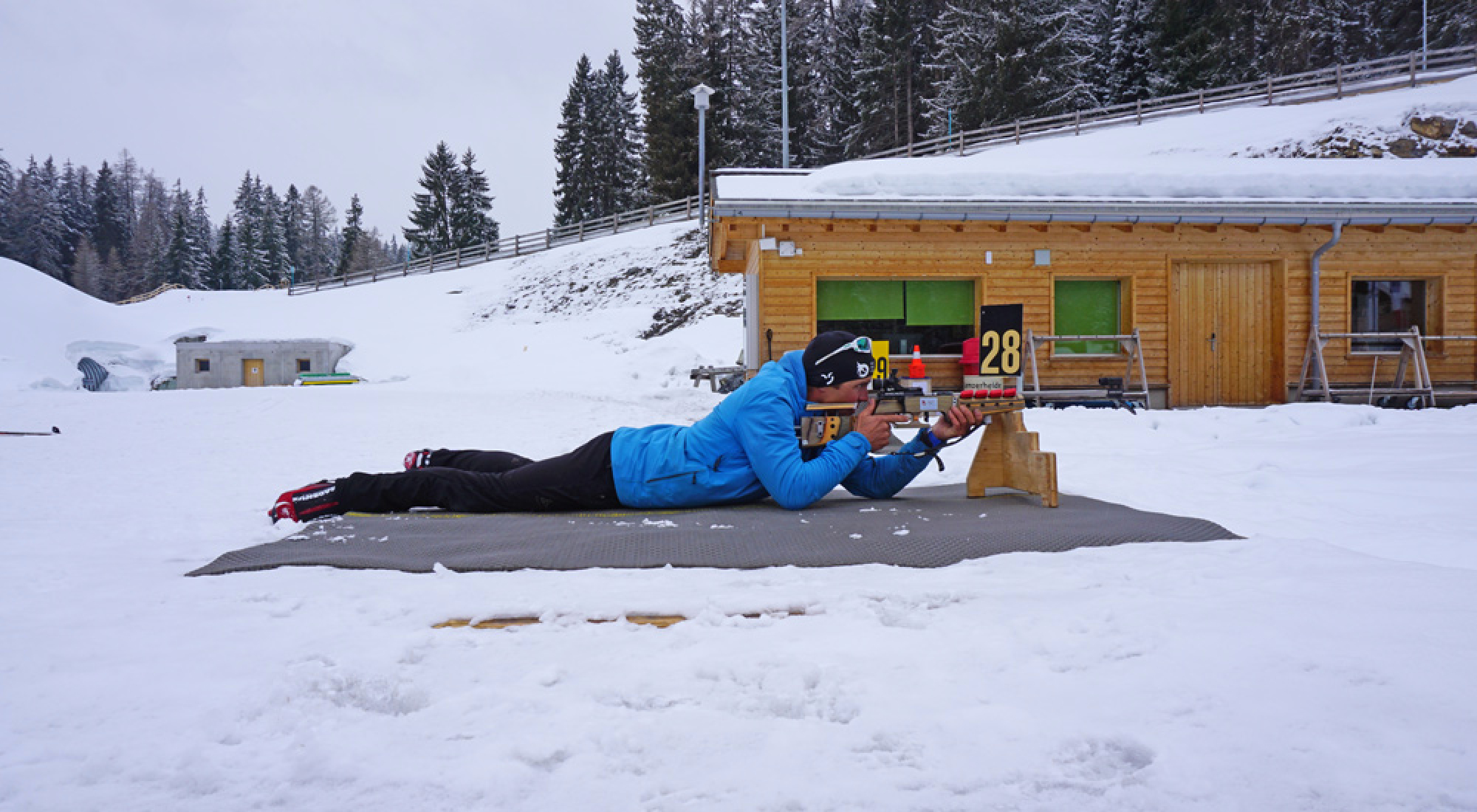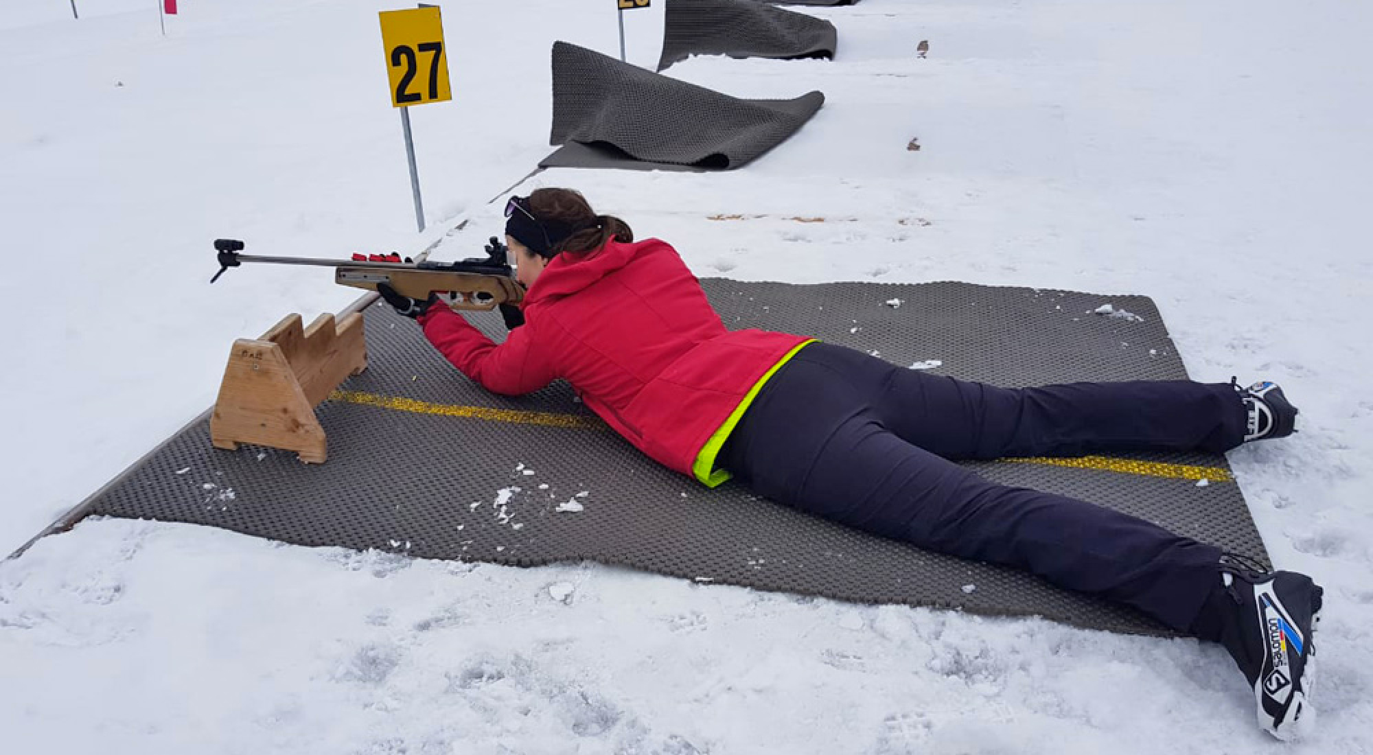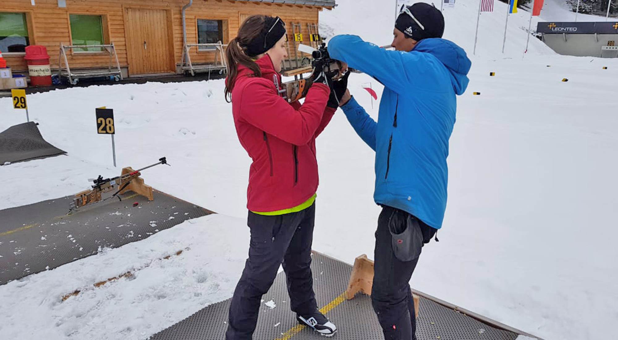 Nachdem wir jetzt in den zwei Teildisziplinen des Biathlons erste Erfahrungen gesammelt haben, wollen wir nun beides zusammenführen und unser eigenes, kleines Biathlon-Rennen veranstalten. Da wir die richtige Runde noch nicht schaffen, veranstalten wir einen Mini-Mini-Sprint: Zunächst geht es eine kurze Skating-Runde einmal um den Schießstand herum, dann wird liegend geschossen. Dank fünf Treffern dürfen wir direkt wieder auf die Strecke! Wieder zurück am Schießstand heißt es dann Stehendschießen - das ist mit höherem Puls und schnellerem Atem sogar noch schwieriger.