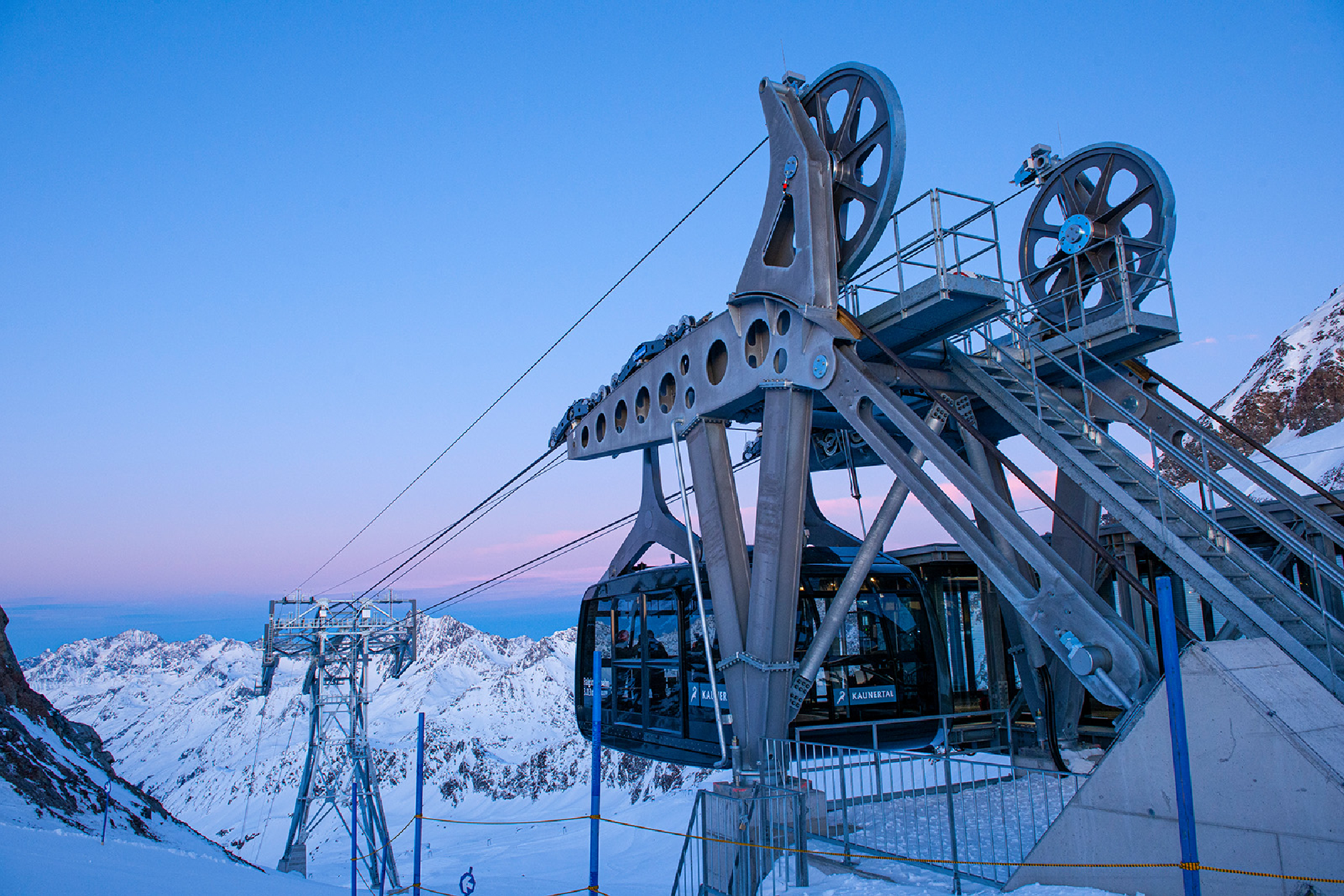 Die Bahn ist als Schau-Seilbahn konzipiert, schlichte und hochwertige Architektur mit vielen Glaselementen gewährt Einblicke in die dahinterliegende Seilbahntechnik. Die beiden Stationsgebäude gliedern sich harmonisch in die Landschaft ein. „Die exponierte Lage und eine den hochalpinen Verhält-nissen angepasste, verkürzte Bauzeit von nur sechs Monaten setzten einen hohen Vorfertigungsgrad voraus. Die Vorfertigung leistete einen hohen Beitrag, die Baumaßnahmen vor Ort gering und somit in einem ökologisch vertretbaren Ausmaß zu halten“, erläutert Architekt Carlo Baumschlager von Baumschlager Hutter Partners. „Basis aller gestalterischer Überlegungen waren die notwendigen, sichtbaren technischen Anlagen der Seilbahntechnik wie Antriebe, Seilbahnstützen und Seilverankerungen. Diese bildprägenden Elemente waren Anlass zur materiellen Reduktion in Beton, Stahl und Glas.“