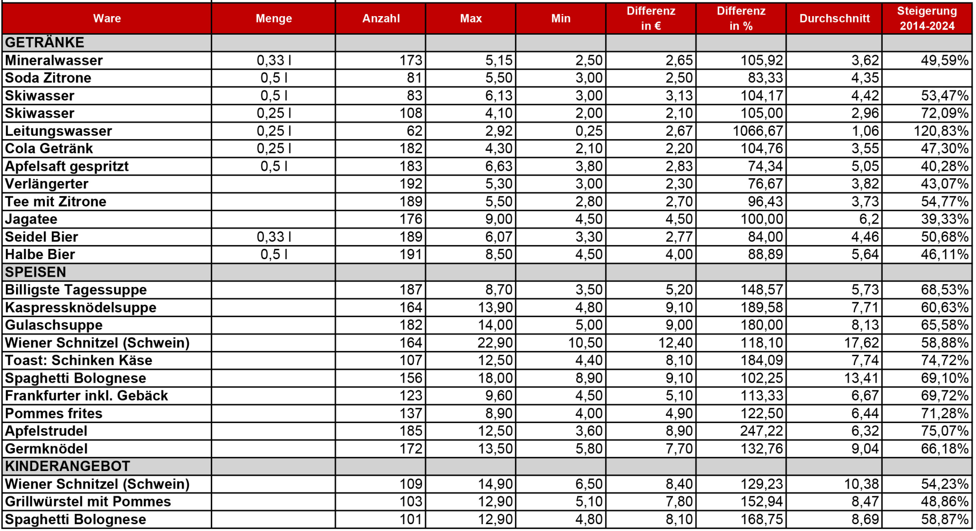 Verglichen mit den Ergebnissen der letzten Erhebung im Jahr 2014 sind die Preise in Salzburgs Skihütten im Schnitt um 59,19 Prozent gestiegen. Der Verbraucherpreisindex (VPI) ist im annährend selben Zeitraum (Jahresdurchschnitt 2013 – 2023) um 33,5 Prozent gestiegen. „Zieht man die Ergebnisse unserer letzten Gastronomie-Erhebung (September 2013 – 2023: + 49,18 Prozent) heran, zeigt sich eindeutig, dass die Skihüttenpreise über Gebühr angestiegen sind“, analysiert Konsumentenschützer Christian Obermoser, der die Erhebung geleitet hat.