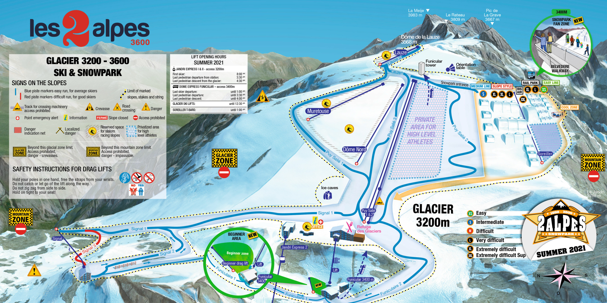 Das Sommerskigebiet von Les 2 Alpes war in den letzten Jahren oft bis in den August hinein geöffnet, in diesem Jahr plant man zunächst nur bis 06. Juli jeden Tag von 8:30-12:30 Uhr zu öffnen. Die Pisten auf dem größten, befahrbaren Gletscher Europas erstrecken sich auf einem Areal zwischen 3200 und 3600 Meter Höhe. Das Highlight ist der Snowpark, der auf 18 Hektar mehrere Lines, einen Railpark und eine Cool Zone mit Barbecue bietet. Das Skigebiet ist im Sommer hauptsächlich für Skirennen, Profis und Skilehrer (Trainingslager, Snowpark...) gedacht.