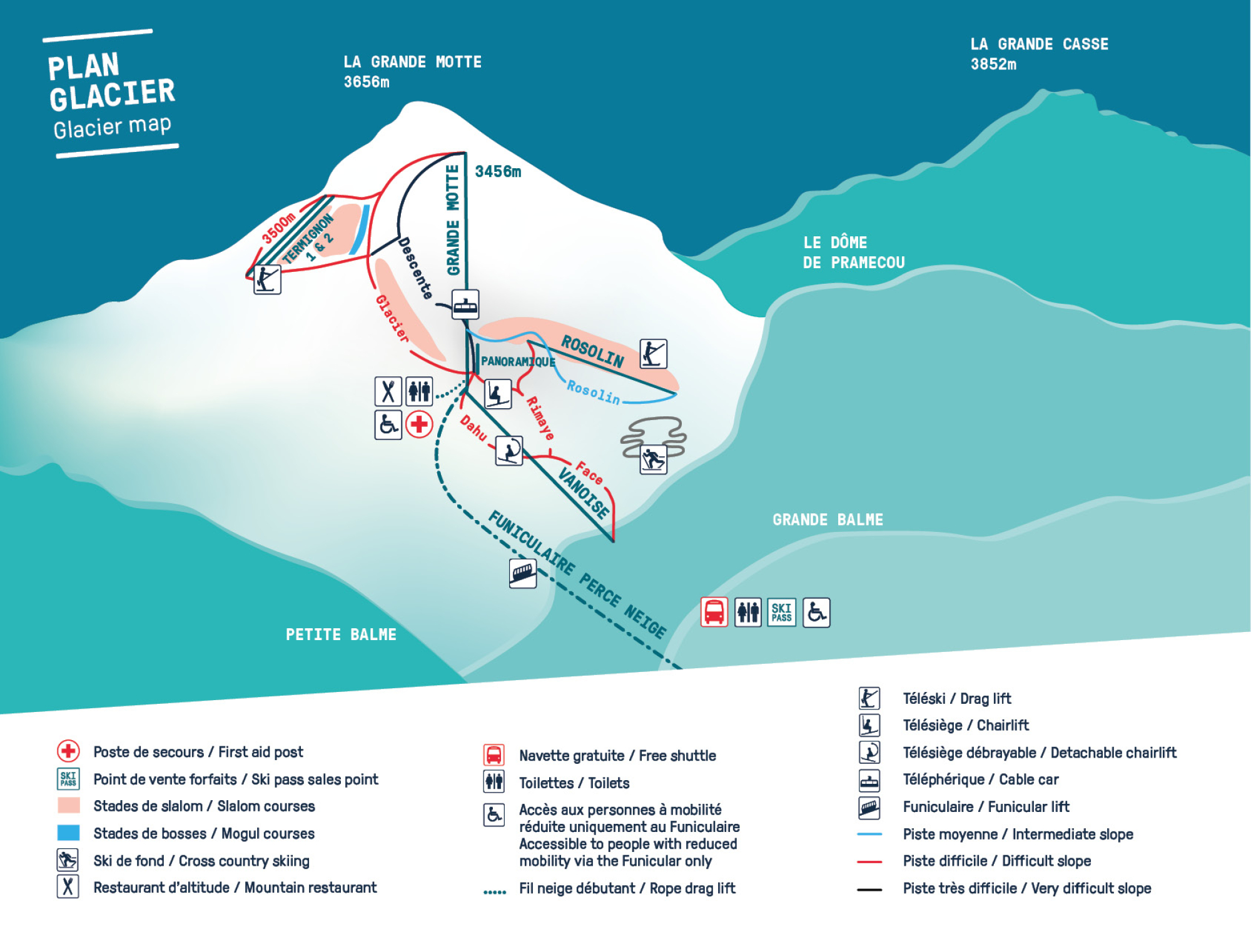 Abhängig von der Schneesitutation wird das Sommerskigebiet von Tignes vom 21. Juni 20. Juli 2025 geöffnet sein. Am Grand Motte Gletscher kommt man auf knapp 3500 Meter hinauf, die Gletscherpisten sind bereits von 06:45 Uhr morgens und bis 12:30 Uhr am Mittag geöffnet. Anders als in den anderen Sommer-Gletscherskigebieten sind hier bei guten Bedingungen sogar zwei Sessellifte geöffnet.