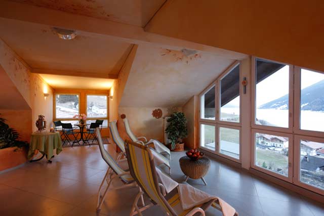 Nach einem aktiven Tag in der alpinen Bergwelt lässt es sich wunderbar entspannen. Wohlige Wärme empfängt Sie im Wellness-Sauna-Bereich unter dem Dach des Hotels. Täglich im Winter ab 16.00 Uhr können Sie den Besuch in der finnischen Panoramasauna mit herrlichem Ausblick auf den Reschensee und die umliegende Bergwelt genießen. Ein Solarium und eine Infrarot-Saunakabine runden das Angebot im Hotel ab.