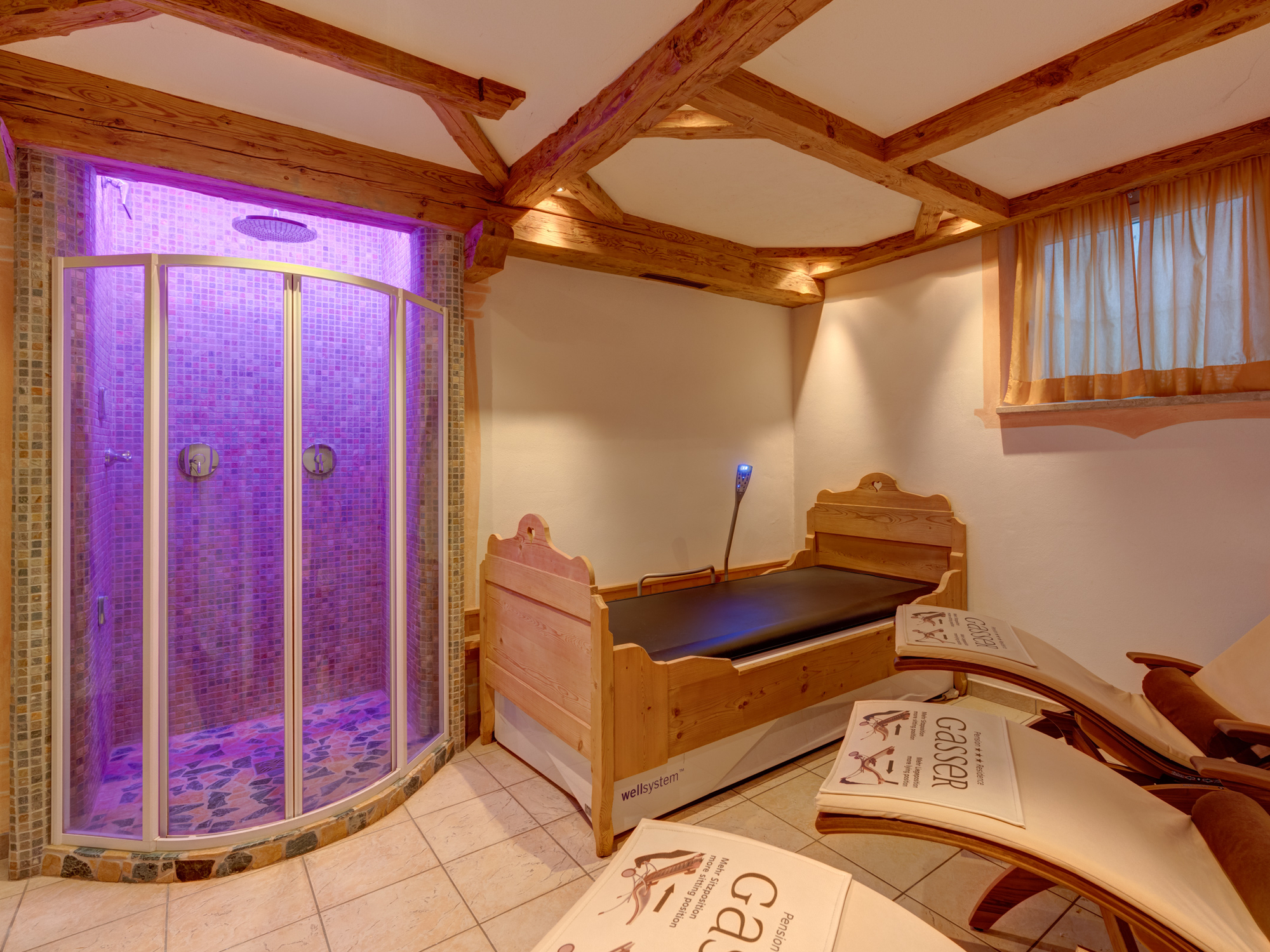 Den idealen Ausklang für Ihren aktiven Urlaubstag bietet Ihnen die kleine, aber feine Wellnessoase. Umrahmt von sanfter Musik laden hier Infrarot Sauna, Finnische Sauna, Solarium und Erlebnisduschen zum Entspannen ein. Gegen Aufpreis werden Ihnen auch wohltuende Massagen auf dem Almbett angeboten.