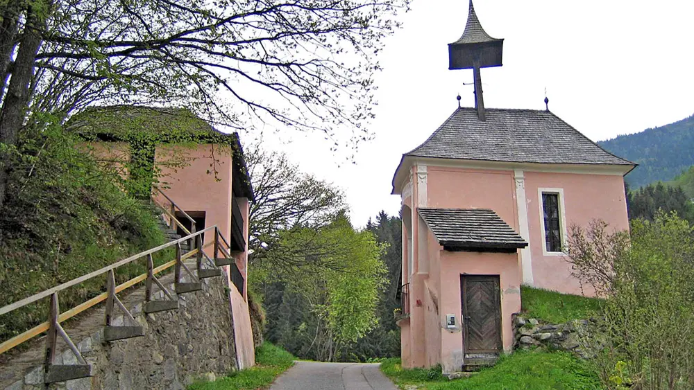 Blick auf die durch eine Straße Geteilte Kirche am Kreuzbichl in Gmünd in Kärnten © Popie, Wikimedia Commons (CC BY-SA 3.0)