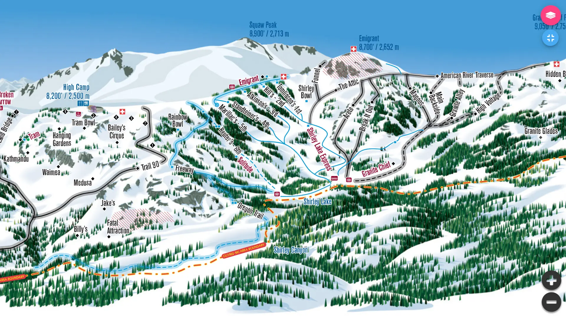 Insgesamt 170 bestens präparierte Pisten, 16 Bowls sowie vier Terrainparks bieten ideale Bedingungen und genügend Abwechslung für Wintersportler. Etwa 25 % aller Skipisten sind für Anfänger geeignet, 45 % haben einen mittleren Schwierigkeitsgrad und 30 % der Pisten sind ausschließlich für Profis gedacht. Die längste Piste des Skigebiets ist mit 3,2 Meilen der Mountain Run.