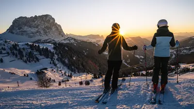 Skifahrer vor der beeindruckenden Dolomiten-Kulisse
