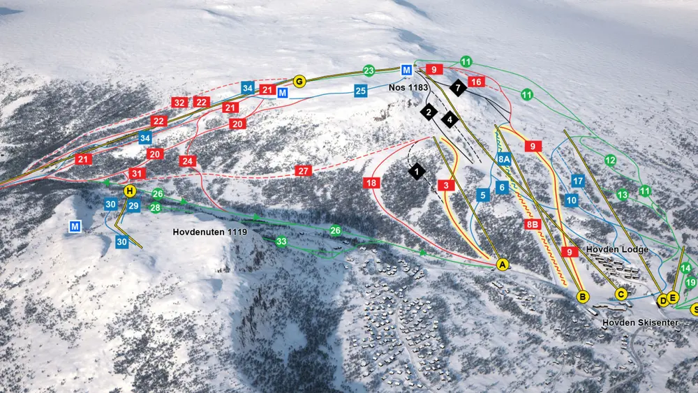 Blick auf die Pisten im Skigebiet Hovden